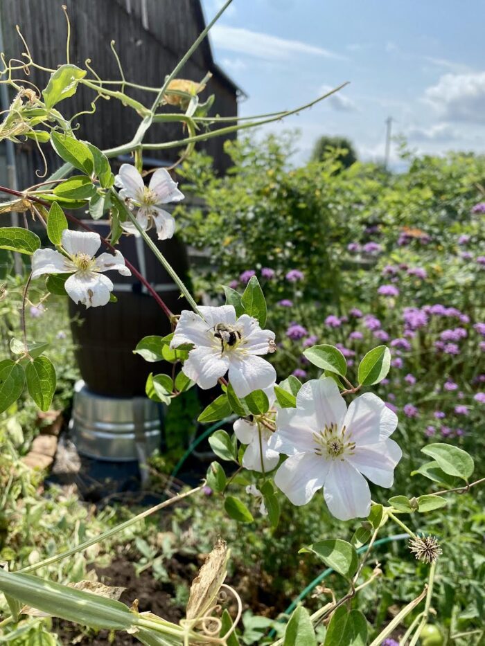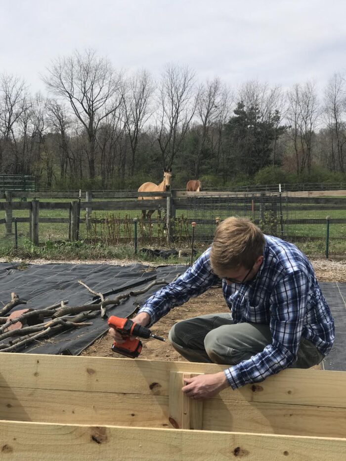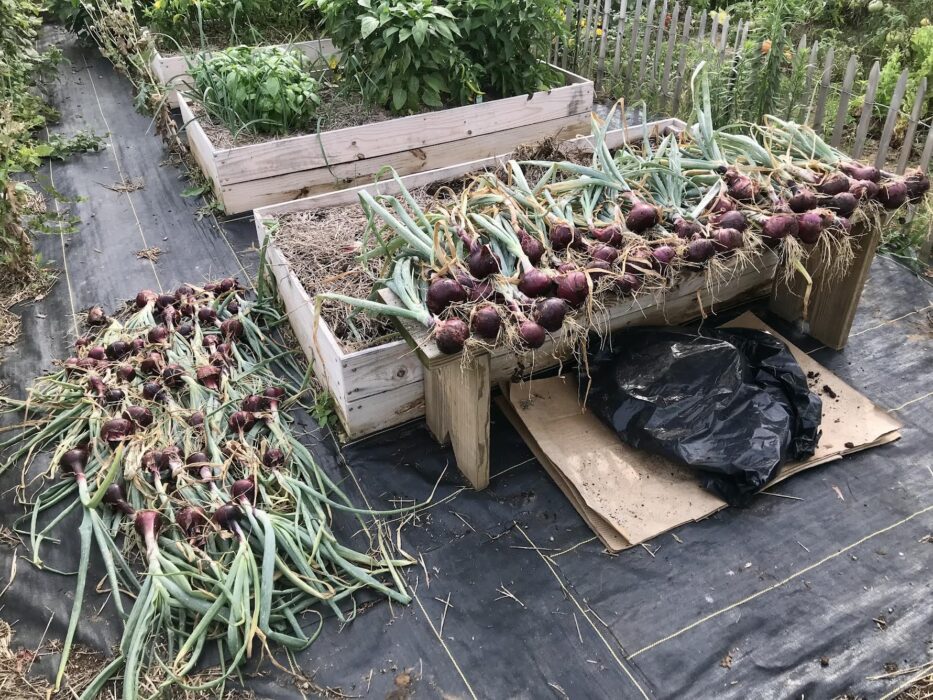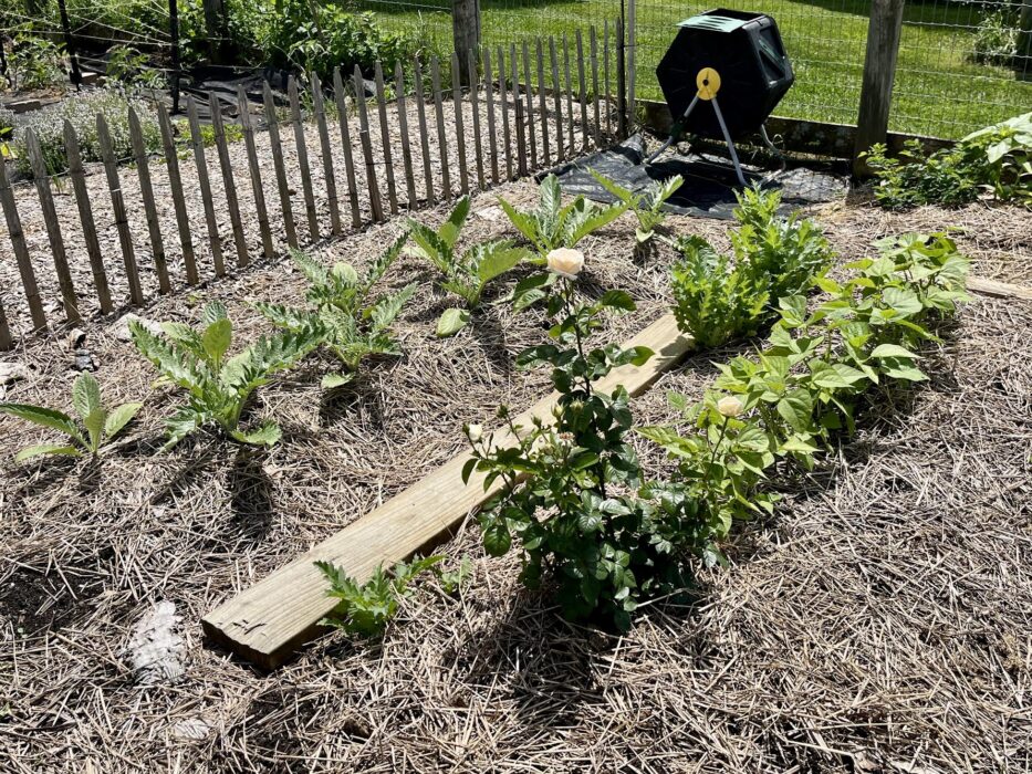 2020: We built a few raised beds out of some pieces of lumber we had lying around like fence panels and the like. Having raised beds has been fantastic–it’s really helped us grow more in a smaller space while also making watering and weeding a bit easier. We top it off every year with fresh compost and we tend to rotate crops so we’re not growing the same thing in the same bed year after year. (That being said, we’ve recently moved some of the roses into a couple of the raised beds and are filling around them with perennial herbs like lavender.)