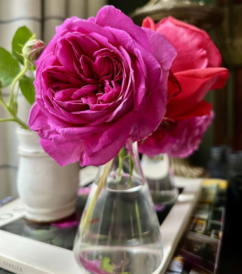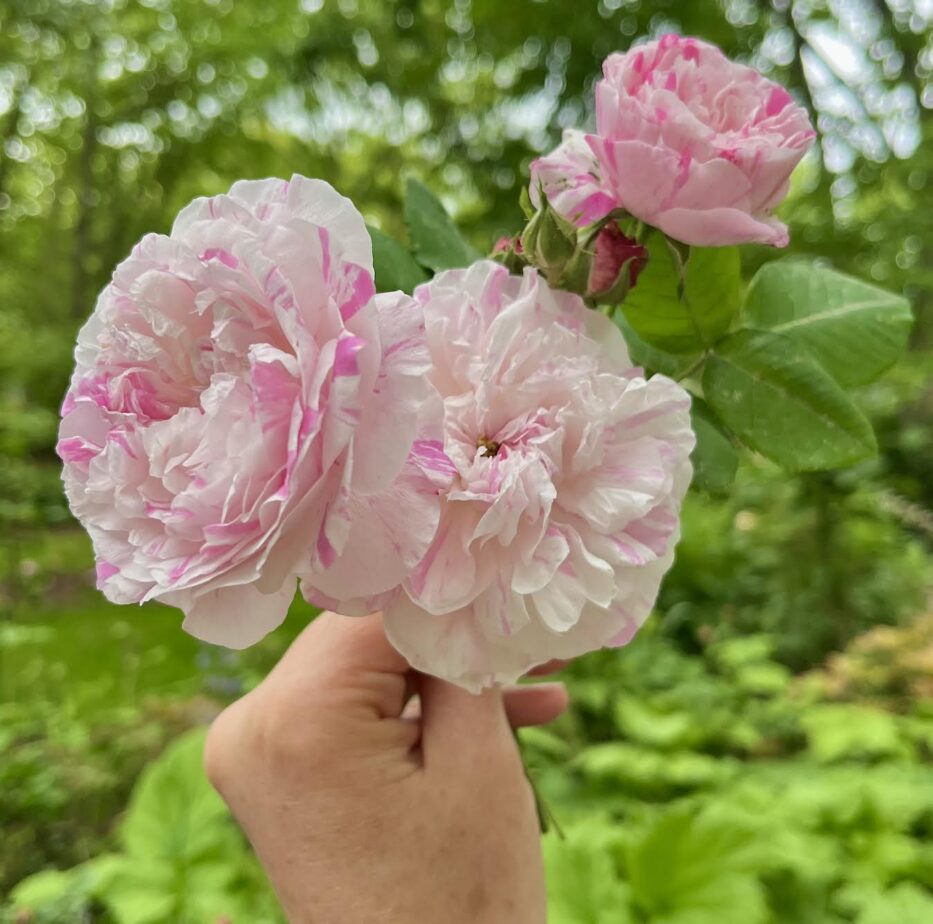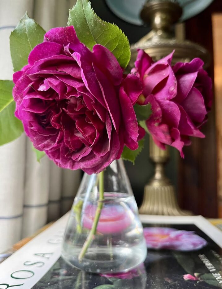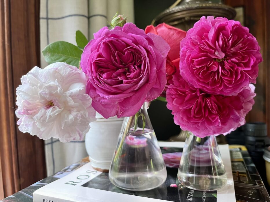 Admittedly, as soon as the roses start to flower, I can’t help but pick them to bring inside. I have several vases of these posies that I carry with me around the house and call my “emotional support roses.” ‘Munstead Wood’ was snipped and brought indoors as soon as it opened and once ‘Mme Isaac Pereire’ put out her first flower, I had to bring it home from the allotment so I could sit and gaze at it all day. Of course, I grew Mme Isaac’s sport, Madame Ernest Calvat for years and years so I figured it was time to grow the parent. So far, I like them both equally. They’re absolute stunners!