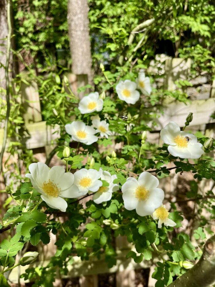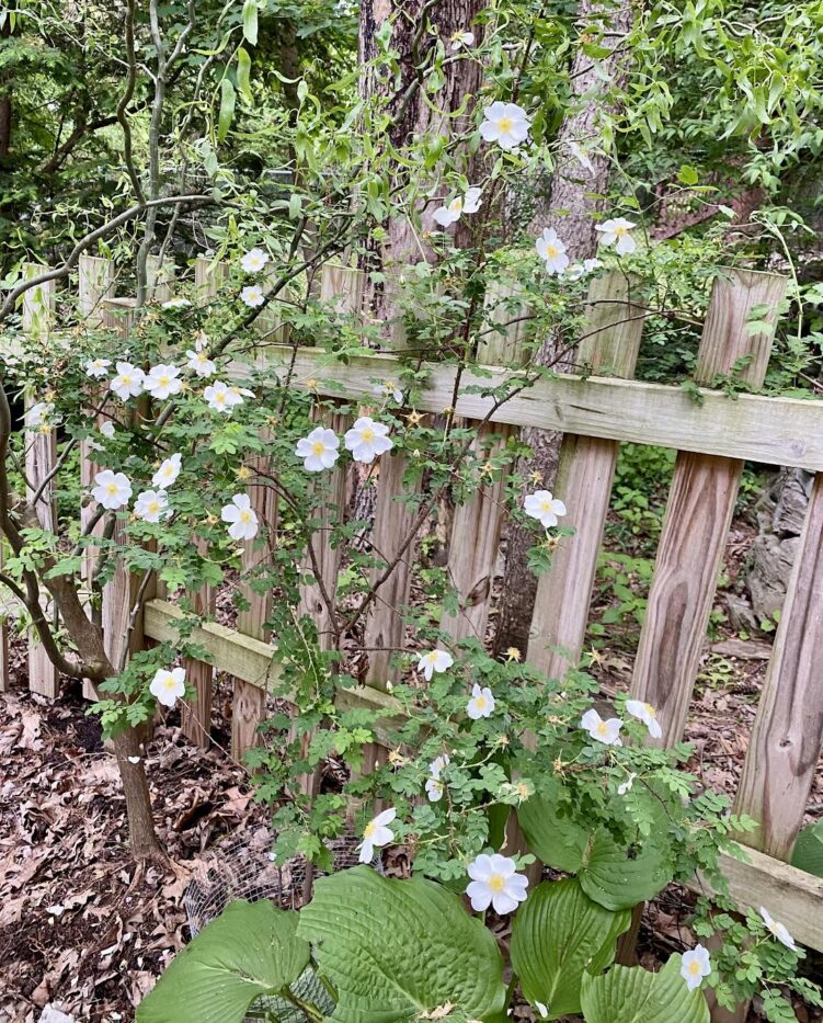 We have several species roses in our woodland garden. Some are performing better than others. Realistically, I know I need to move some of them to our allotment garden–more on that in a moment.