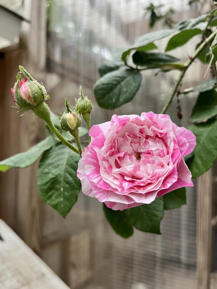 Here’s another antique beauty which flowers mid May in our garden: Centifolia Variegata / Village Maid. Ours is still in a great big container alongside the chicken barn. We had every intention of planting her directly in the ground but she seems so happy how she is, so we’ve quite left her to her own devices. The flowering of this rose for me is very bittersweet because it was at this same time last year that our beloved hen, Nutmeg, passed away and I can’t help but associate the two events.