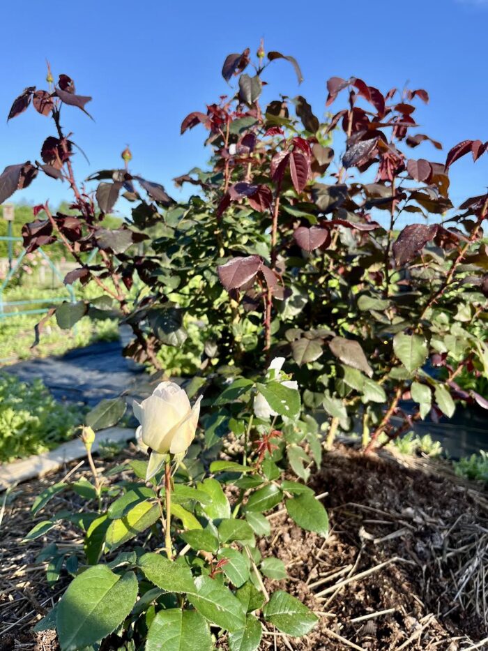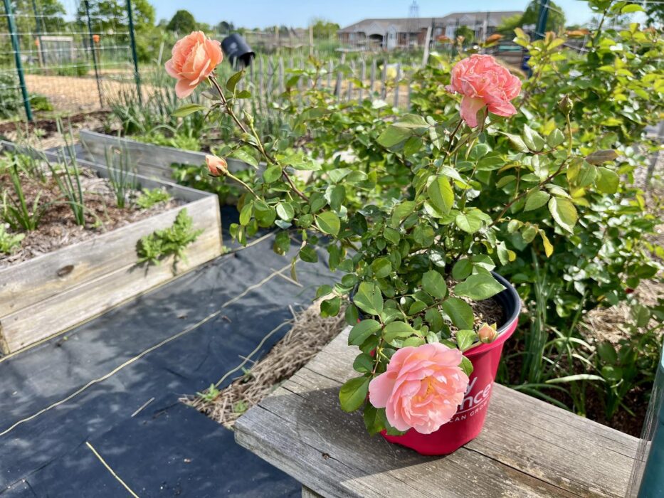 Some of you may recall that in addition to our home garden, which is about 3 years old now, we have a small plot in our local community garden. As our new home is on a very wooded plot, many of our roses were moved to our sunny, open allotment to be enjoyed mainly as cut flowers. The allotment has it’s own set of challenges, mainly exposure, but it’s been a great way for us to continue growing the roses we enjoy. Here’s a photo of ‘Sweet Fragrance’ being brought in for planting. ‘Sweet Fragrance’ is a Ping Lim rose; Do you remember this breeder sweeping the awards at Biltmore International Rose Trials in 2015?